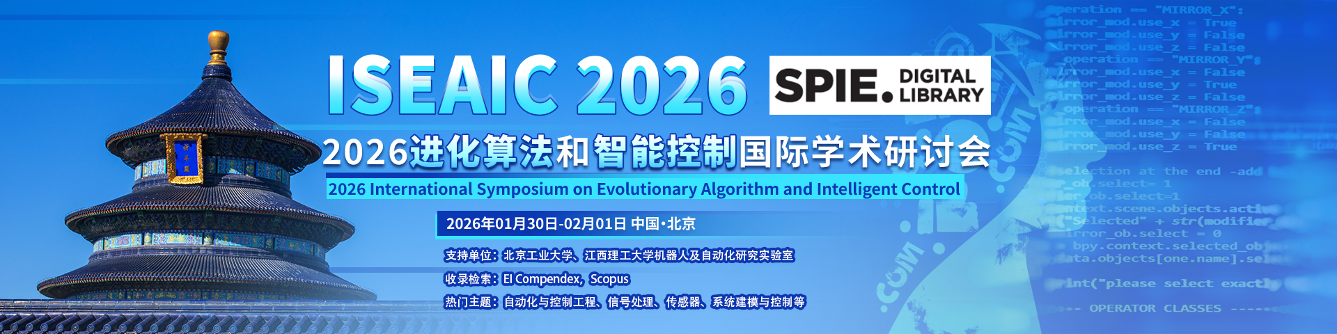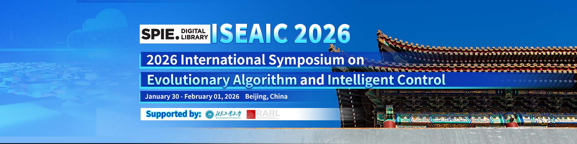 2026 International Symposium on Evolutionary Algorithm and Intelligent Control (ISEAIC 2026) will be held in Beijing, China from January 30 to February 1, 2026.